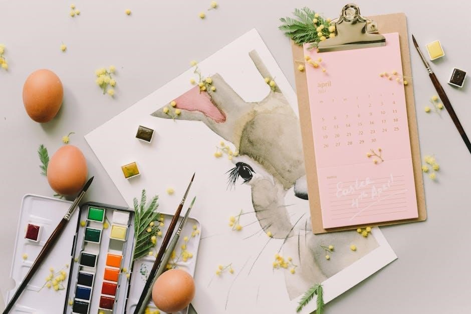 Easter, a significant religious and cultural celebration, falls on Sunday, April 5, 2026․ It marks the resurrection of Jesus Christ and is a time for family gatherings, religious services, and traditional activities like Easter egg hunts․ Including this date in your April calendar PDF helps you prepare for festive plans, such as hosting meals, attending church, or organizing Easter-themed events․ Many businesses and schools also observe this holiday, so marking it on your calendar ensures you stay aware of closures or special schedules․ Use the April calendar PDF to track Easter-related tasks, ensuring you don’t miss important traditions or celebrations․ It’s a key date for faith, family, and joy․