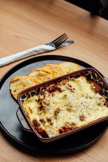 Alternatively‚ line the dish with parchment paper‚ leaving an overhang on the sides for easy removal after baking. This method simplifies cleanup and ensures the lasagna doesn’t stick. Avoid using dark-colored baking dishes‚ as they can cause the lasagna to brown too quickly.